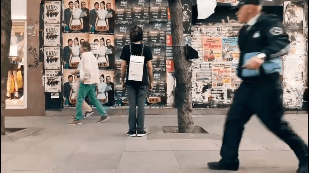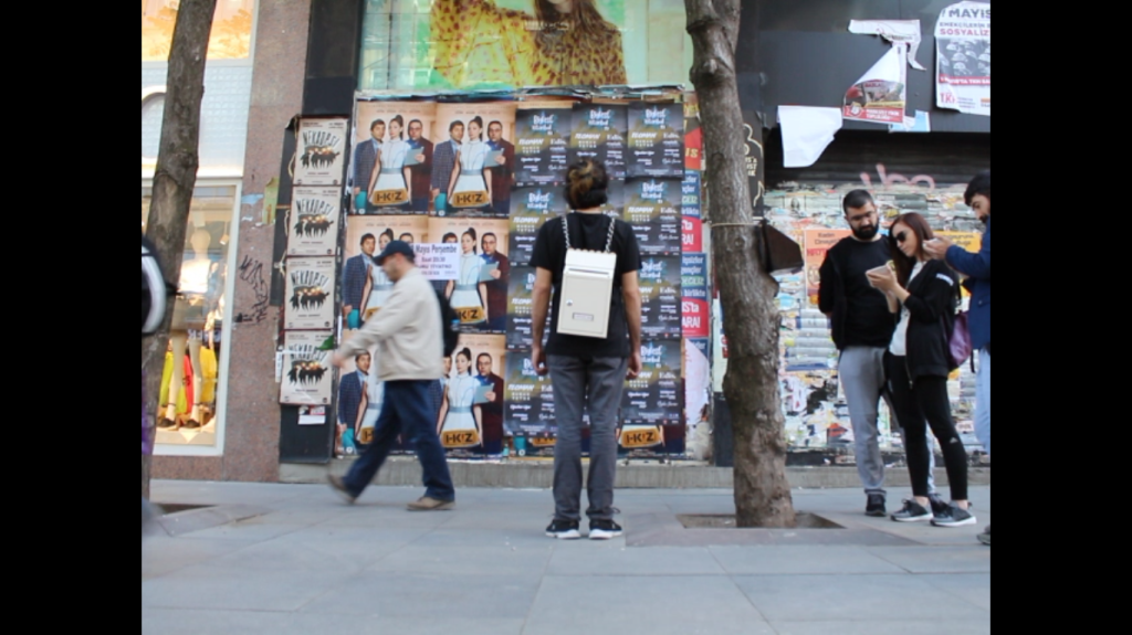 The Complaint Box questions bodily autonomy, the limits of our individuality in everyday life and its contrast to the perspectives and judgments of the society. The artist camouflages themself in harmony with the texture of the street and turns into a complaint box. Placing the Complaint Box in the body carries a performative concept of every step and action in everyday life, and has an interactive function that offers participation to the people passing by.