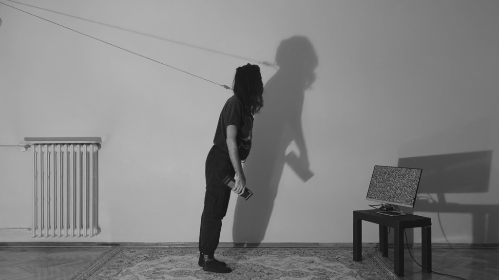 In Horizontal Execution, Diren Demir moves steadily toward a screen until the rope around their neck fixes the body in place. The moment of suspension becomes a study of how agency is narrowed by forces that appear voluntary yet operate as constraint. The work reflects on the tension between choice and fate within contemporary media ecologies: we move toward images that promise orientation, yet the same images script our gestures, expectations, and thresholds of endurance. The performance examines how bodies are disciplined by what they are compelled to watch, how spectatorship becomes a site of subtle coercion, and how consent is manufactured through repeated exposure. Demir stages this collision between self-directed movement and imposed trajectory, inviting a reading of the body as both actor and instrument in a system where autonomy is under continuous attack.