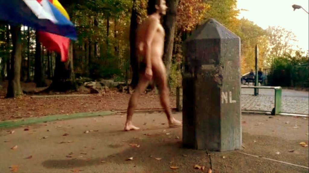 Diren examines the reality of laws and social fabric. Each country’s own social structure become more insignificant in the area of intersection with the border regions, while increasing it’s authenticity as it moves to the center of that country. In order to expose the unspoken structure of rules, laws and social fabric, Diren uses nudity and goes to a crossing point where three countries (Netherlands, Belgium, Germany) intersect and walks along the boundary lines.