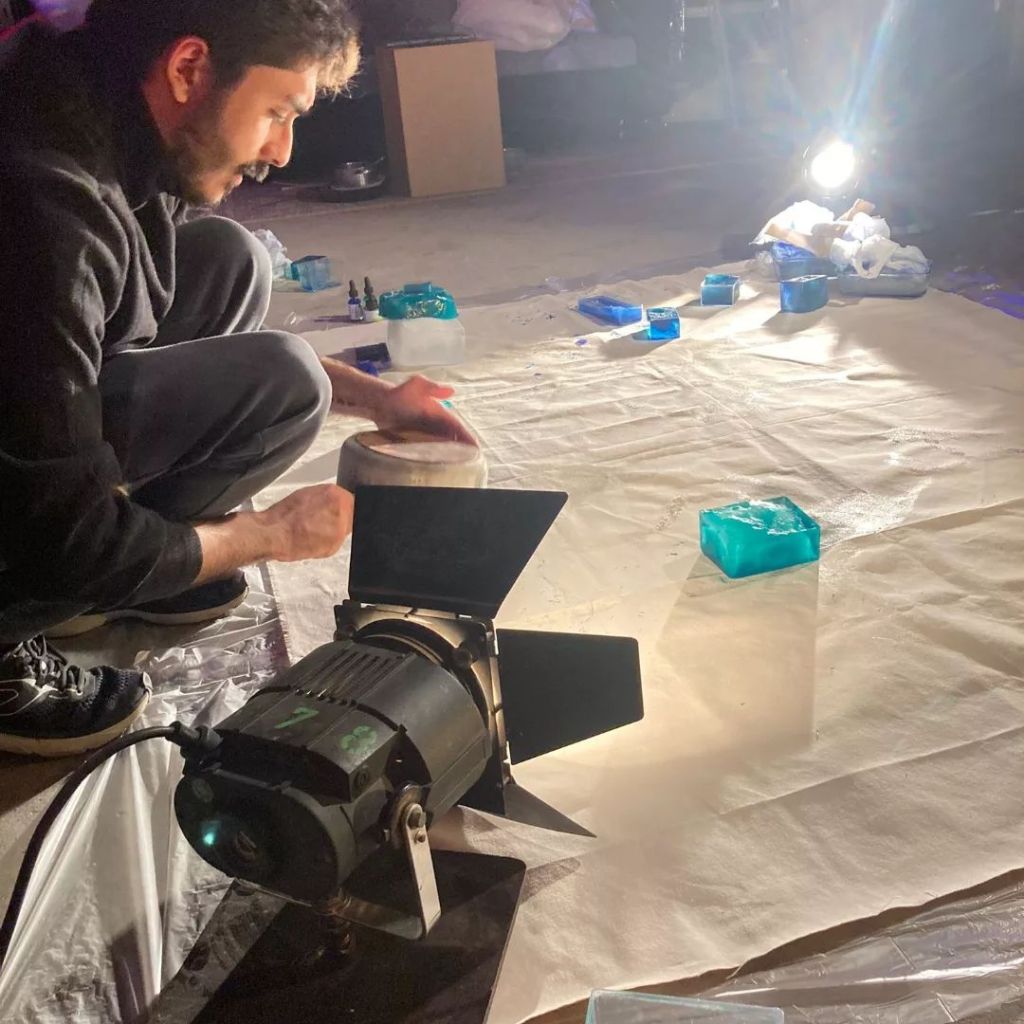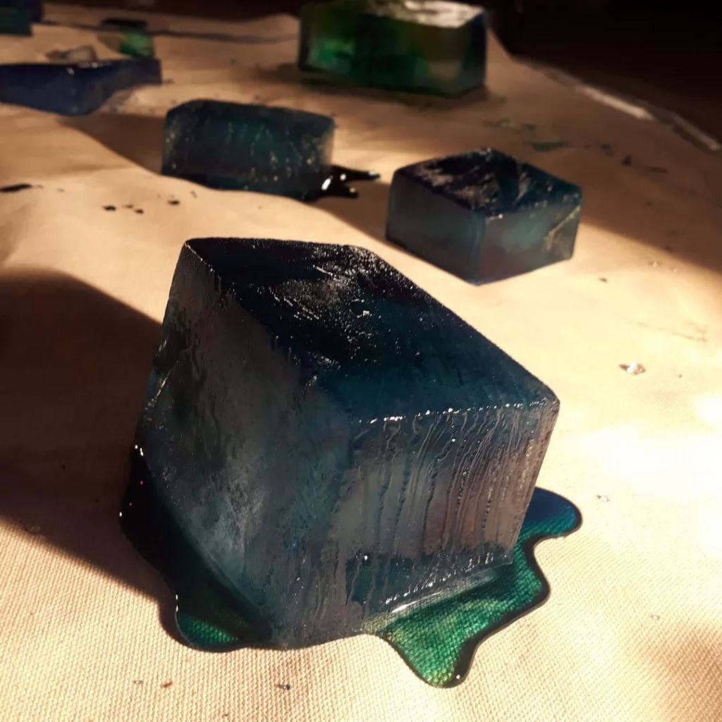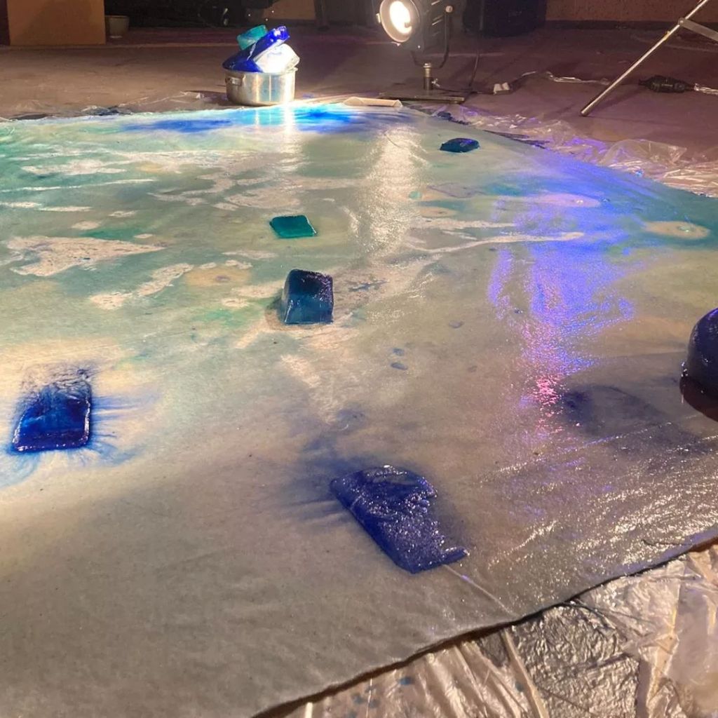 The Map of the Seas performance deals with the melting of the polar ice caps due to global warming. Arctic glaciers have been significantly destroyed for many reasons, including greenhouse gas emissions, the search for oil and natural gas, and increased human activity in the Arctic Ocean. Map of the Seas draws attention to the Anthropocene Age, the most recent geological epoch, during which the geology and ecosystems of the Earth have been radically altered as a result of human impact. We are reminded that glaciers are melting and disappearing from the map every day. In the performance, dyed ice cubes of different sizes are placed on a canvas. Demir creates a spontaneous and new world map as the ice cubes melt due to the heat emitted from mobile light sources during this long-term performance.